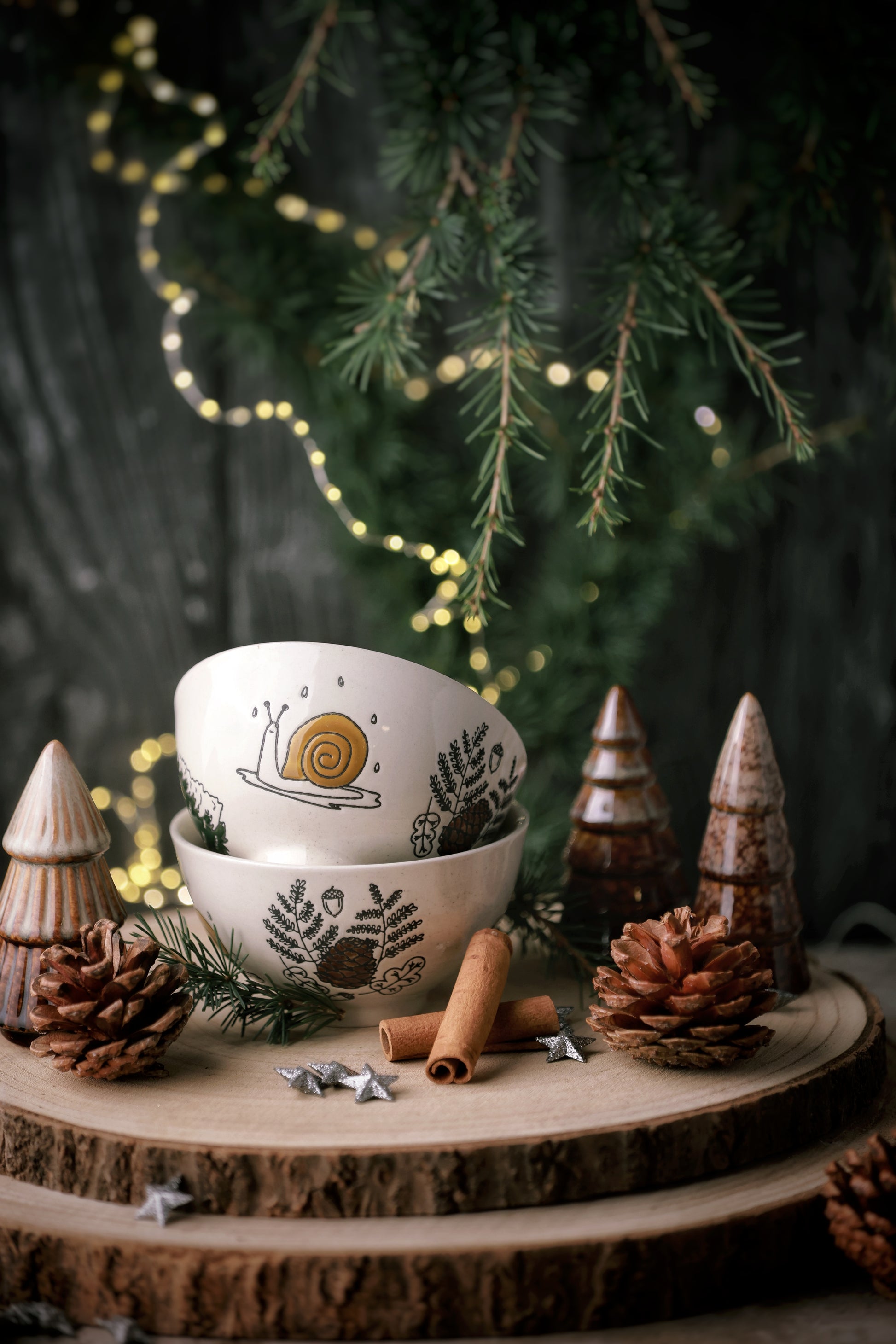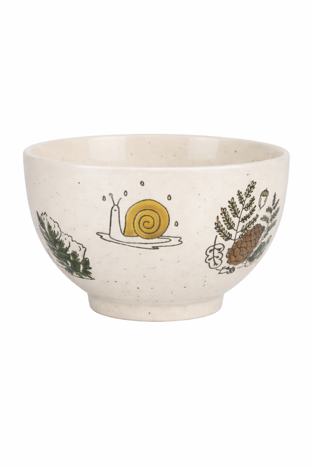 - Ce charmant bol en céramique invite à une balade en pleine nature grâce à ses motifs d'automne inspirés de la forêt : on y retrouve de jolis champignons, un escargot, des sapins et des pommes de pin, délicatement illustrés pour créer une ambiance douce et chaleureuse.