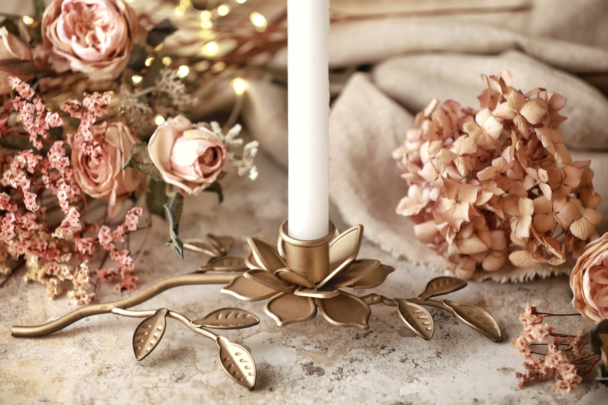 - Adoptez ce bougeoir en métal finition dorée qui représente une rose en éclosion, délicatement posée sur une branche ornée de feuilles finement travaillées.