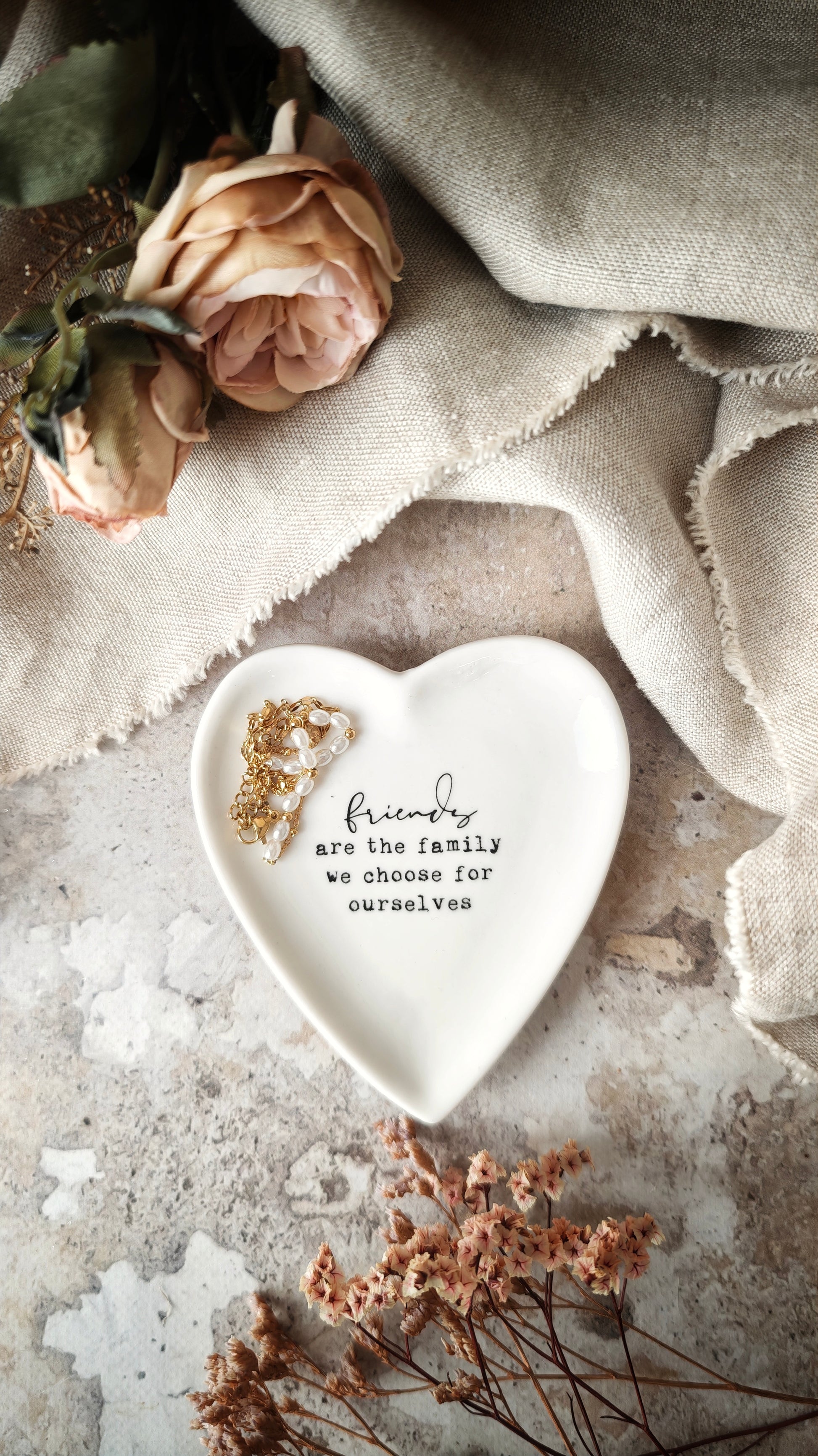 Ce délicat plat à bijoux en céramique se présente sous la forme d’un cœur aux lignes douces et épurées. Sa finition émaillée blanche lui confère un aspect lisse et lumineux, mettant en valeur l’inscription centrale « Friends are the family we choose for ourselves » réalisée dans une typographie noire au style légèrement vintage.