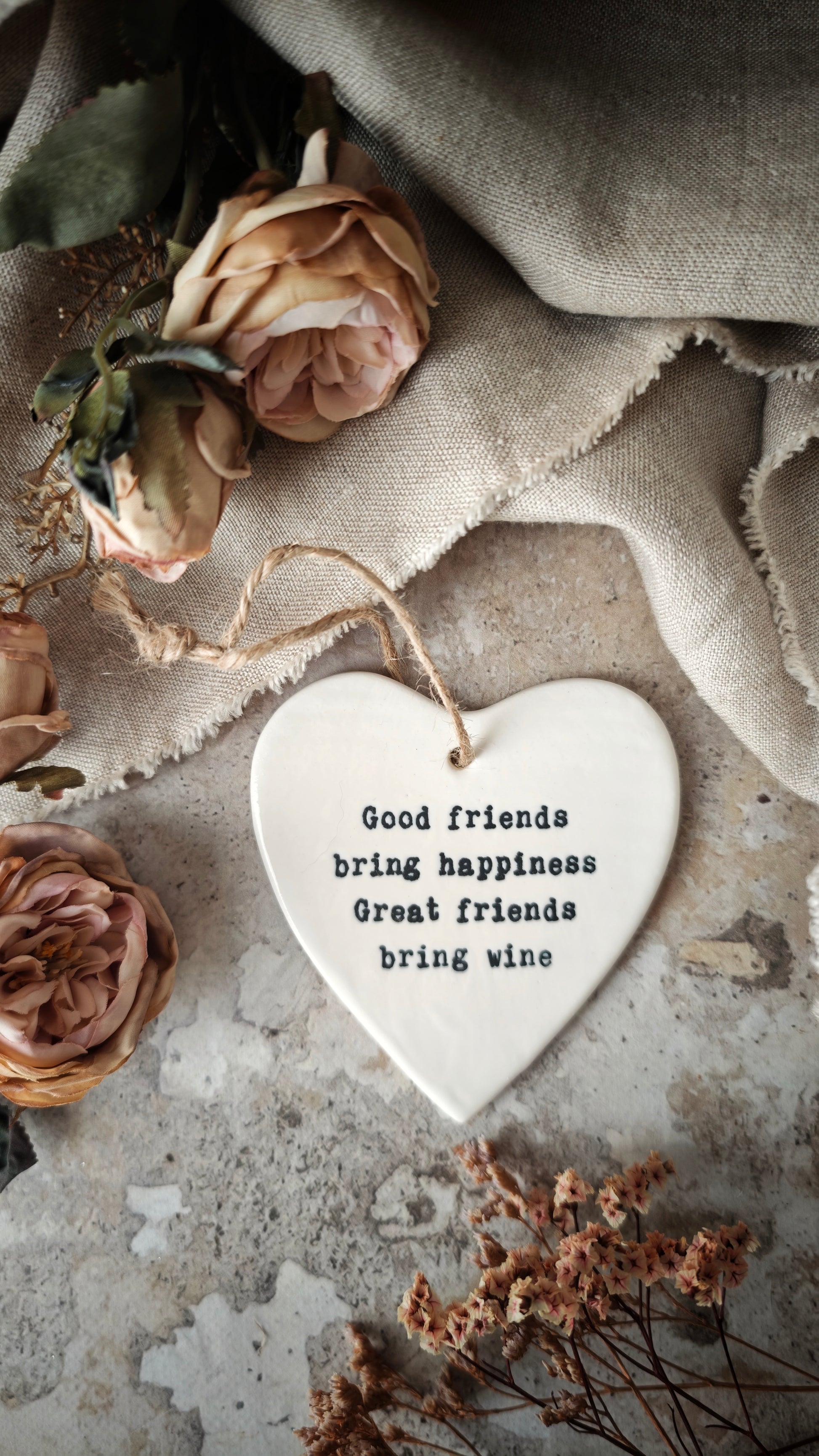 - Son message plein d’humour « Les bons amis apportent le bonheur, les supers amis apportent le vin » en fait une décoration originale au message drôle, parfaite pour célébrer l’amitié avec légèreté. À la fois tendre et amusante, cette suspension diffuse une ambiance joyeuse et complice.