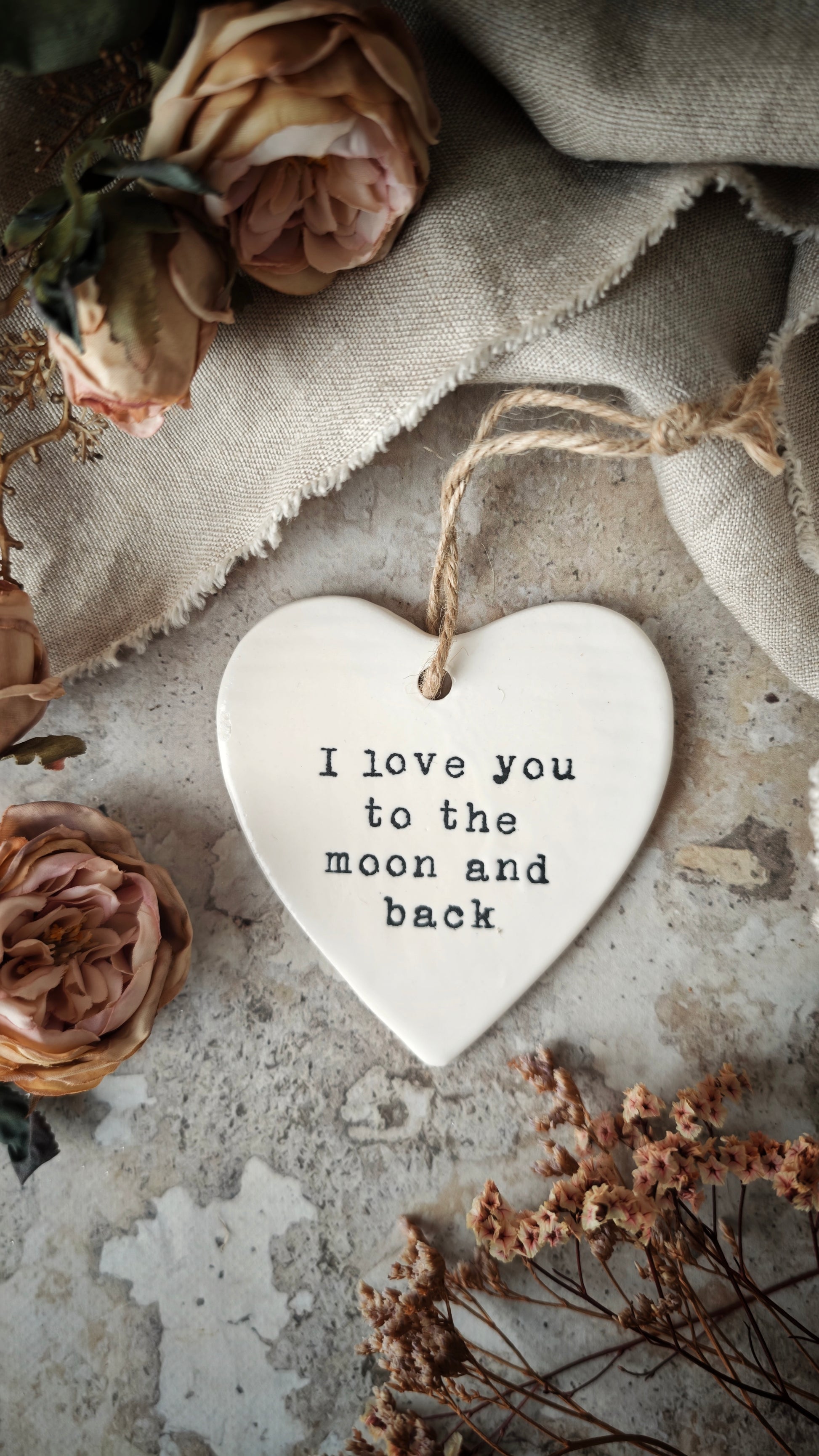 - Cette délicate suspension en céramique prend la forme d’un joli cœur aux courbes douces, sublimé par une finition blanche émaillée lumineuse. Suspendue à une cordelette en jute naturelle, elle se fixe facilement sur une poignée, un mur ou une étagère, apportant instantanément une touche de poésie à votre intérieur.
